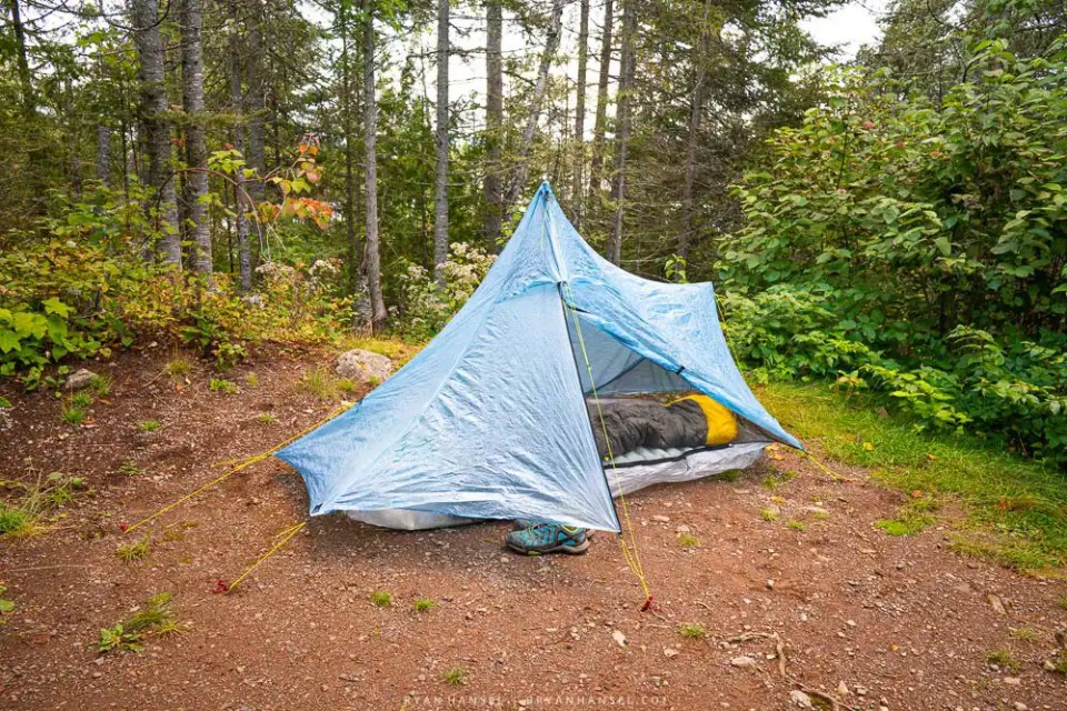 Look for sheltered site protected from the wind, which can strip heat from your tent and sleeping bag. A line of trees makes for a great windbreak that makes a noticeable difference. If you can camp on the west side of the river or lake, you’ll catch the warm morning sun, which can help warm up your tent and make waking up much nicer.